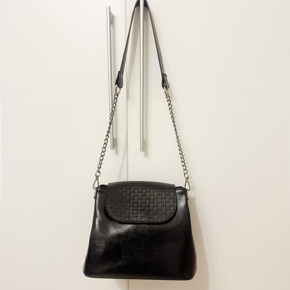 Ceea ce o diferențiază este clapeta cu model împletit, un detaliu subtil și rafinat ce adaugă un plus de stil și originalitate. Combinația dintre pielea netedă și textura clapetei conferă contrast și profunzime designului, transformând-o într-o geantă ce atrage atenția fără a fi ostentativă.